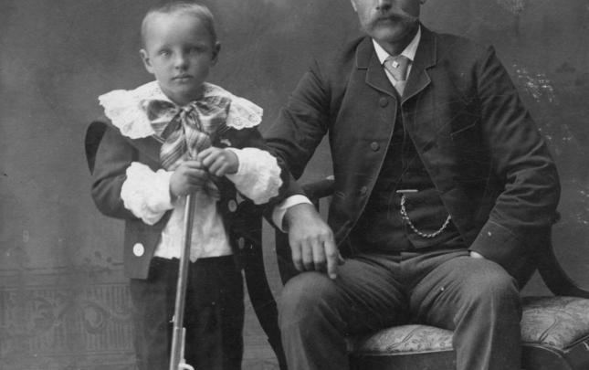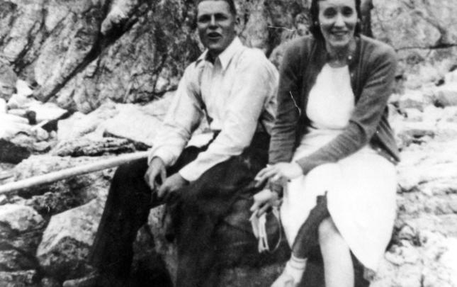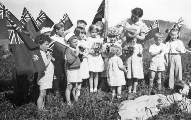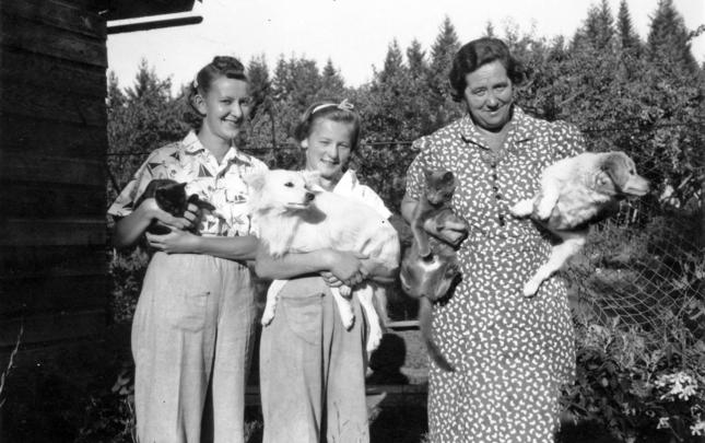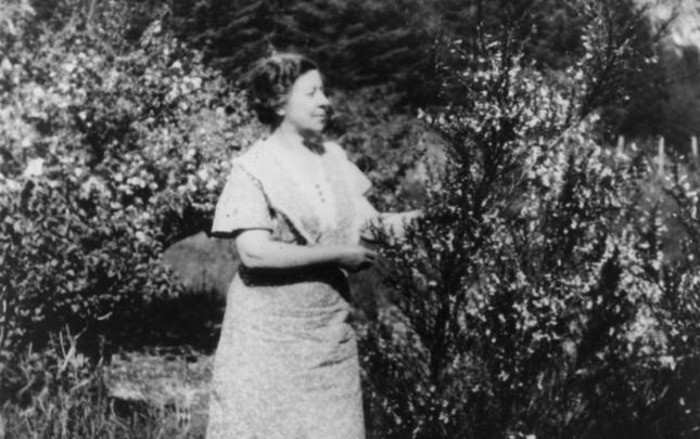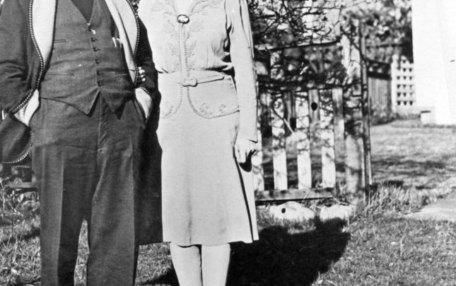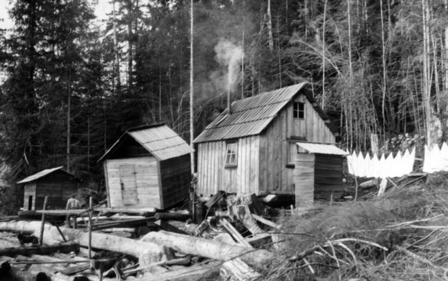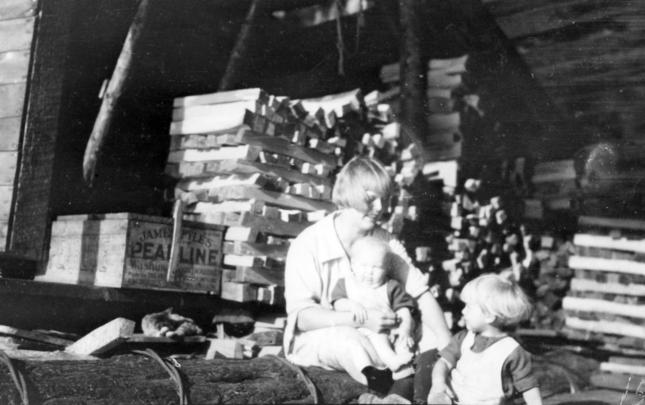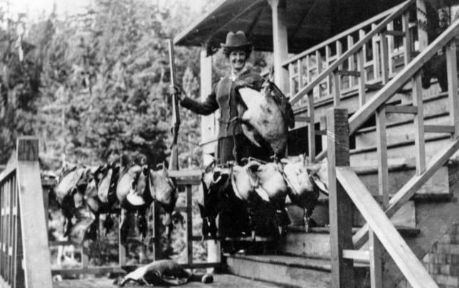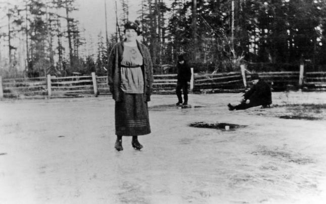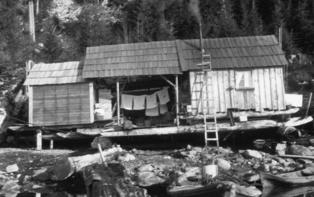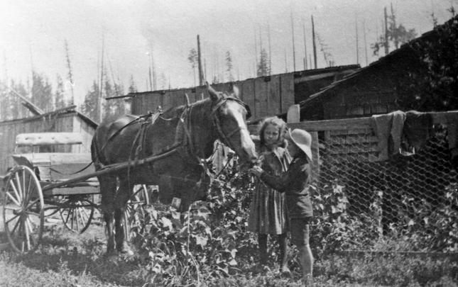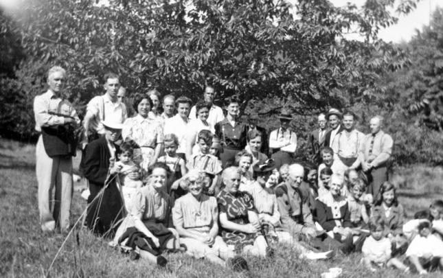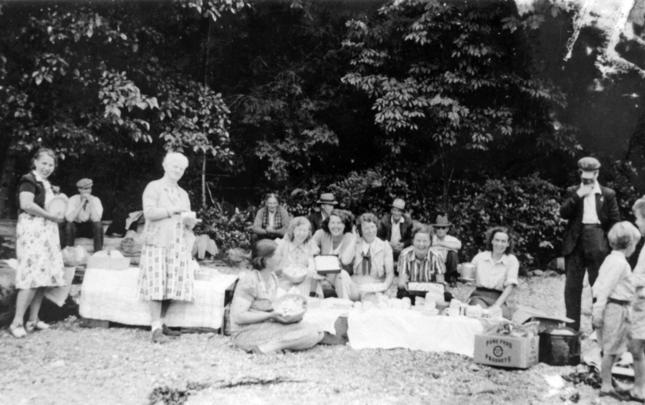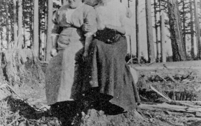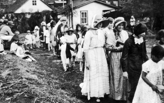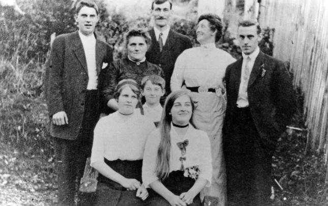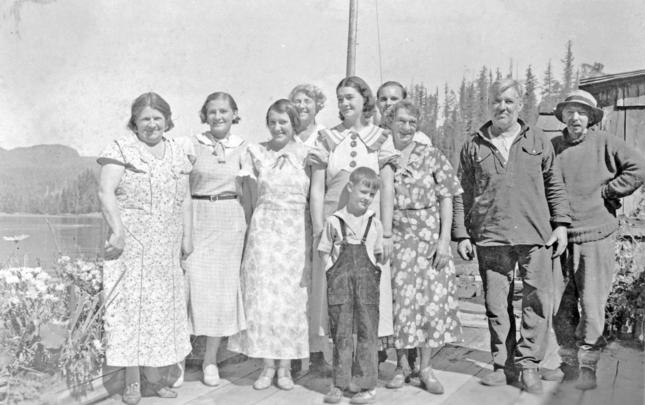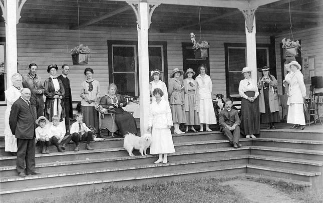 Left to right: Mr. and Mrs. Hosea Bull (owners of the hotel) , Peter Jorgensen, Reverend and Mrs. Scofield, Mrs. Dick, Mrs. Letson (seated), Jenny and Mae Miller (maids at the hotel), Mae and Velma Anderson, Eliz Law, Reverend Fred Comley, Mrs. Law, Unknown, Miss Theodora Spencer (Walker), behind...