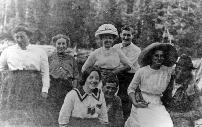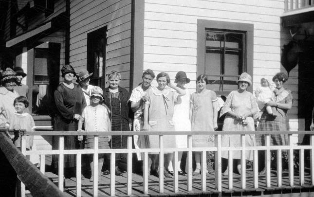 Back from left: Mrs. Michael Manson, Ethel (nee Manson), Mrs. J. Humes, Captain and Mrs. James A. Nixon. Front from left: Hazel (nee Manson) and Henry Heinwig, Mr. and Mrs. Dudley.