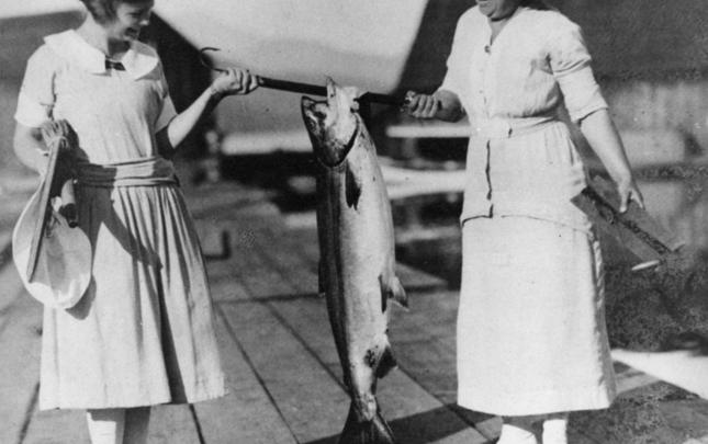 Salmon caught by Agnes (on left) and Miss Hope of Chatham Point. Photo taken at Rock Bay, B.C. Agnes and her husband Henry were early settlers at Granite Bay, Quadra Island.