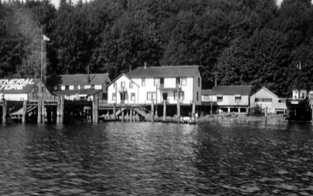 From left: Gas storage, store, Anderson family house, caskhouse(?), tast(?) house. The Anderson family owned and operated the Quathiaski Canning Co. and the house in the center is where they would live when the cannery was operating.